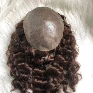 Picture shown the medium brown loose curly skin topper delivers a natural scalp appearance with soft, flowing curls, providing secure, lightweight coverage for thinning areas.