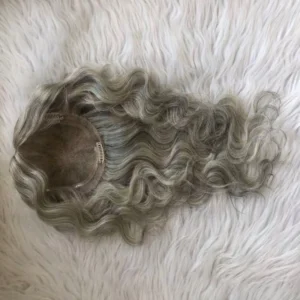 Picture shown the grey curly hair topper offers soft, natural-looking curls with realistic coverage, blending seamlessly to enhance volume for thinning areas.