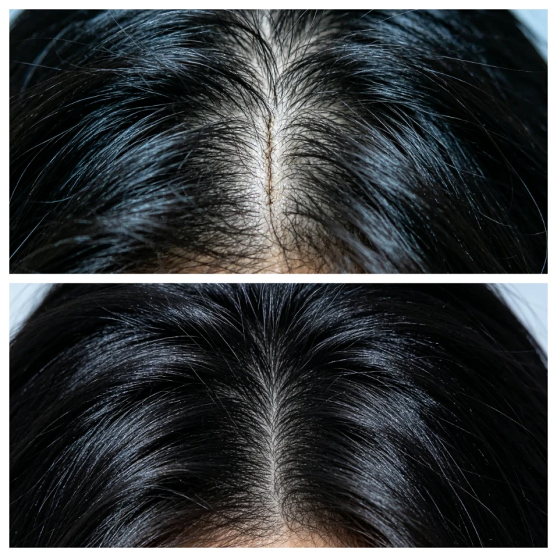 Before and after photos of V Light hair extensions. The top half is Before, and the bottom half is After. Before: The hair was fine, soft, and limp with a noticeable parting and gaps at the hairline, making it look sparse. After: After using V Light micro-dot hair extensions, tiny transparent UV dots appeared at the roots, almost invisible. Short hairs grew out at the hairline, making the hair instantly fuller and more voluminous, with no visible signs of extensions.