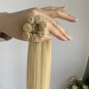 This image showcases premium blonde hand-tied weft hair extensions with ultra-thin, neatly rolled wefts and smooth, silky strands for a natural, seamless finish.