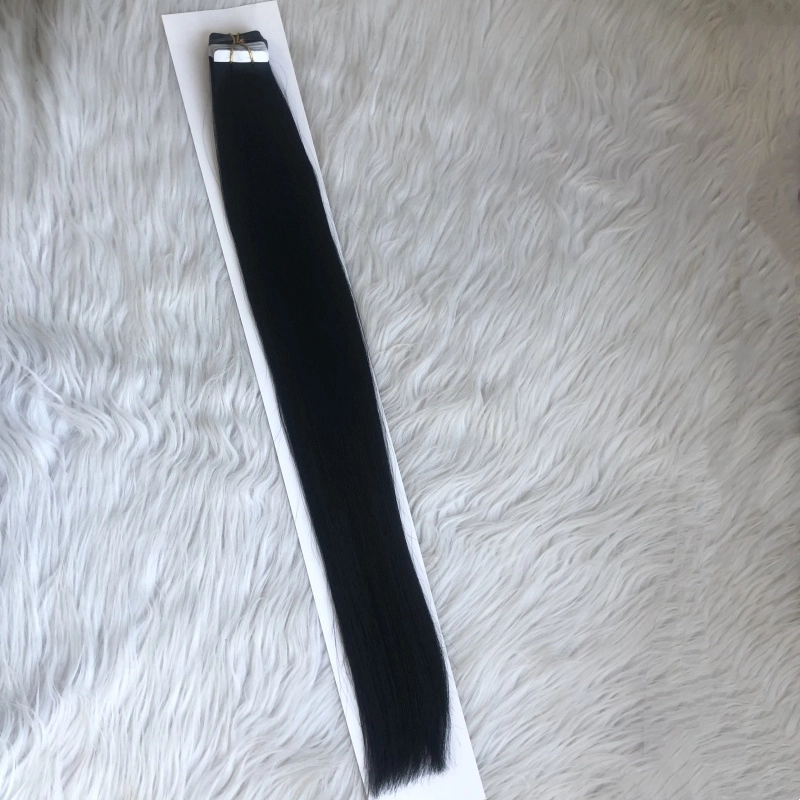Picture shown Jet black tape-in Remy hair offers a sleek, glossy, deeply pigmented black shade with ultra-flat adhesive panels for a seamless and natural-looking blend.